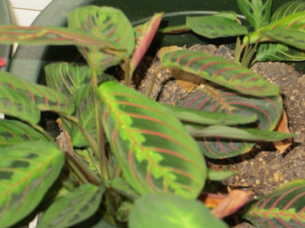 Prayer plants are unique because of the way pairs of leaves close together at night like hands in prayer. They are also known as red herringbone plants because of the leaves’ deep red, raised veins. The red midrib is surrounded by a pale-green stripe on the olive green leaf.