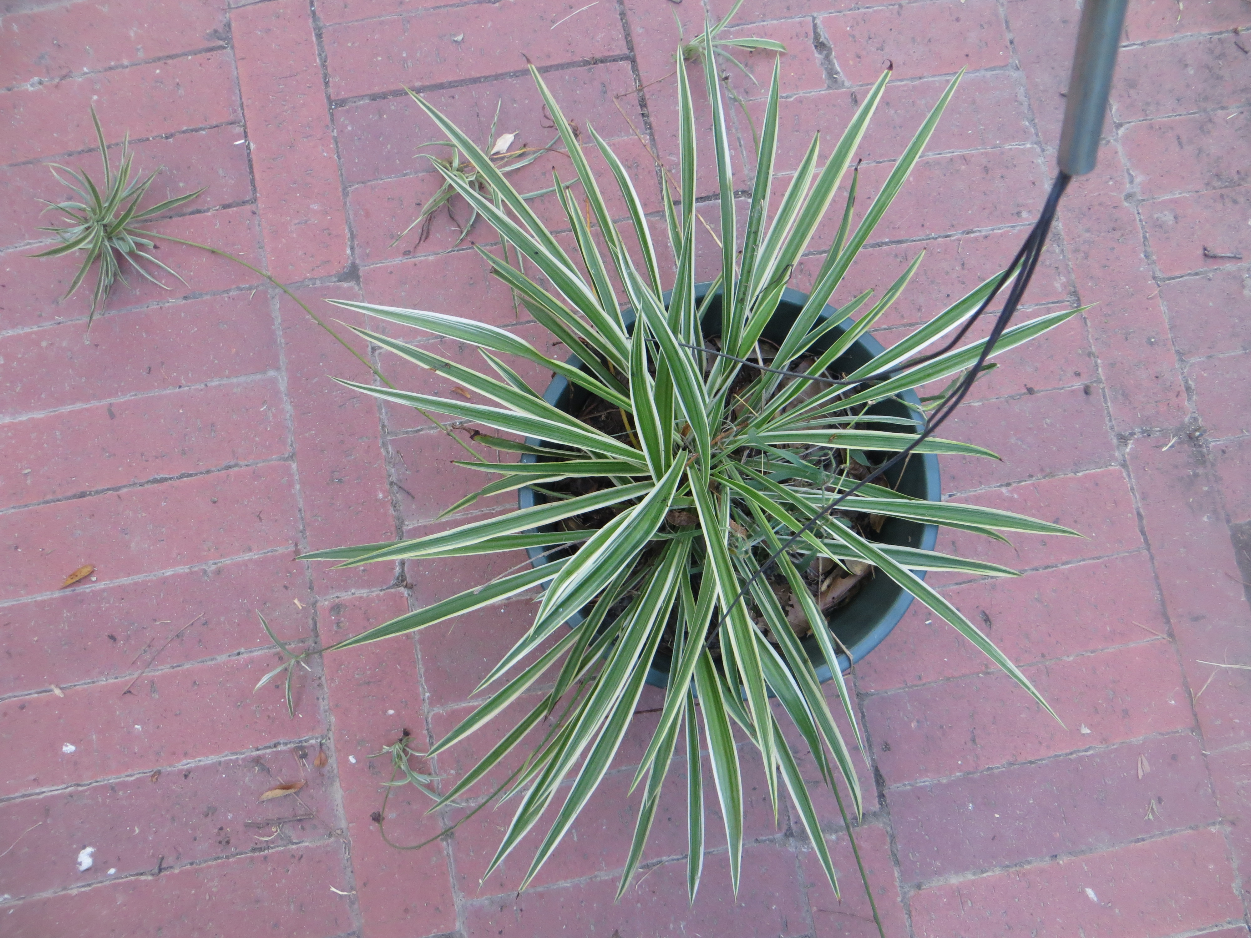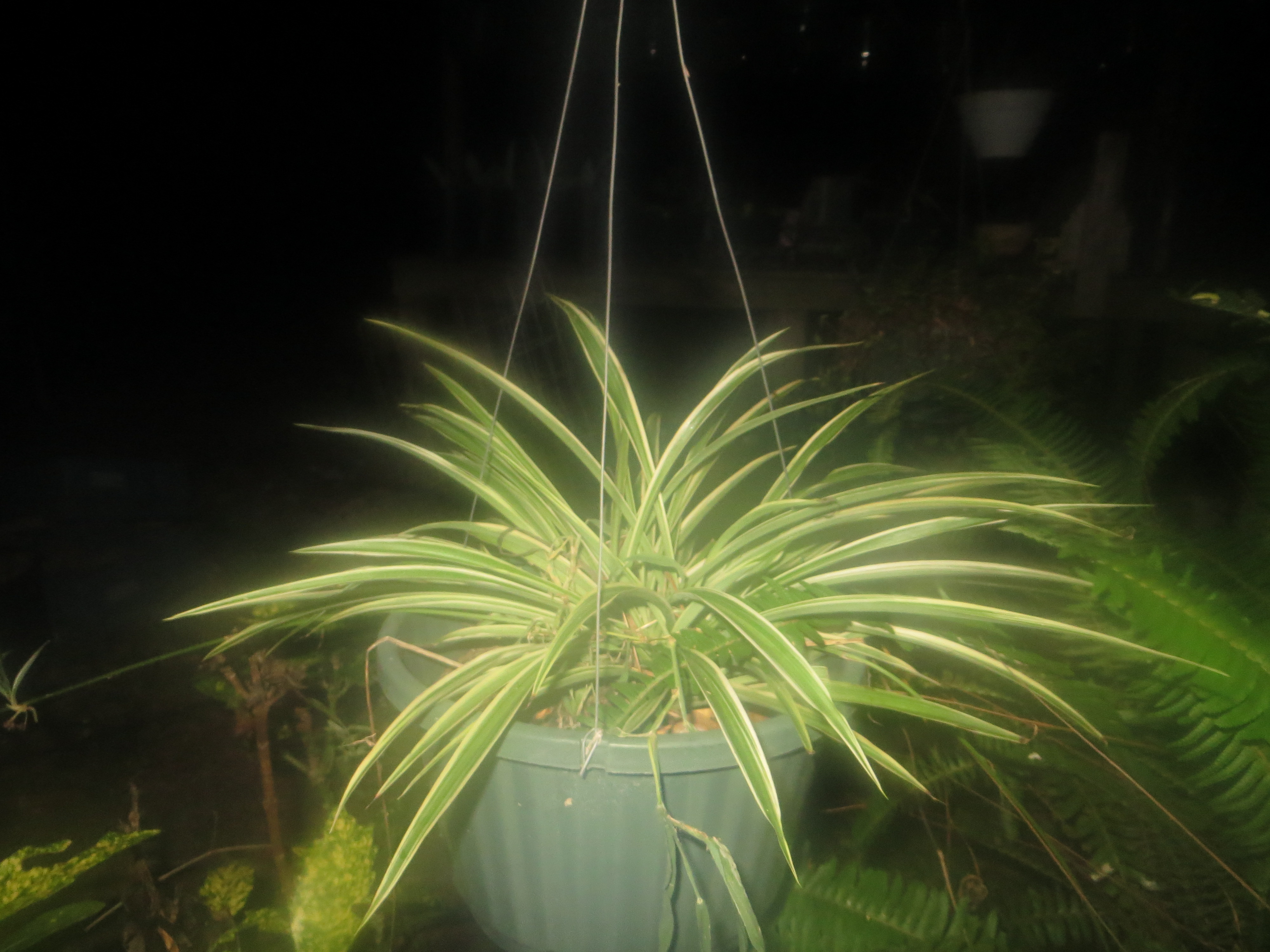 Spider plants(Chlorophytum comosum) outside or inside. The common inside plant may be in hanging basket or plant container. These hybrids have a distinctive white or crème stripe down the center of each leaf. The narrow leaves arch over, but the true trailing effect is produced by long stems bearing numerous plantlets. Well-grown specimens are striking when displayed from heights. Also the plantlets may be removed after flowering, and used out doors as a ground cover. a plantlet already has open roots that can be planted in ground with leaves showing. Frogs outside in the ground covering keeps insect population controlled.