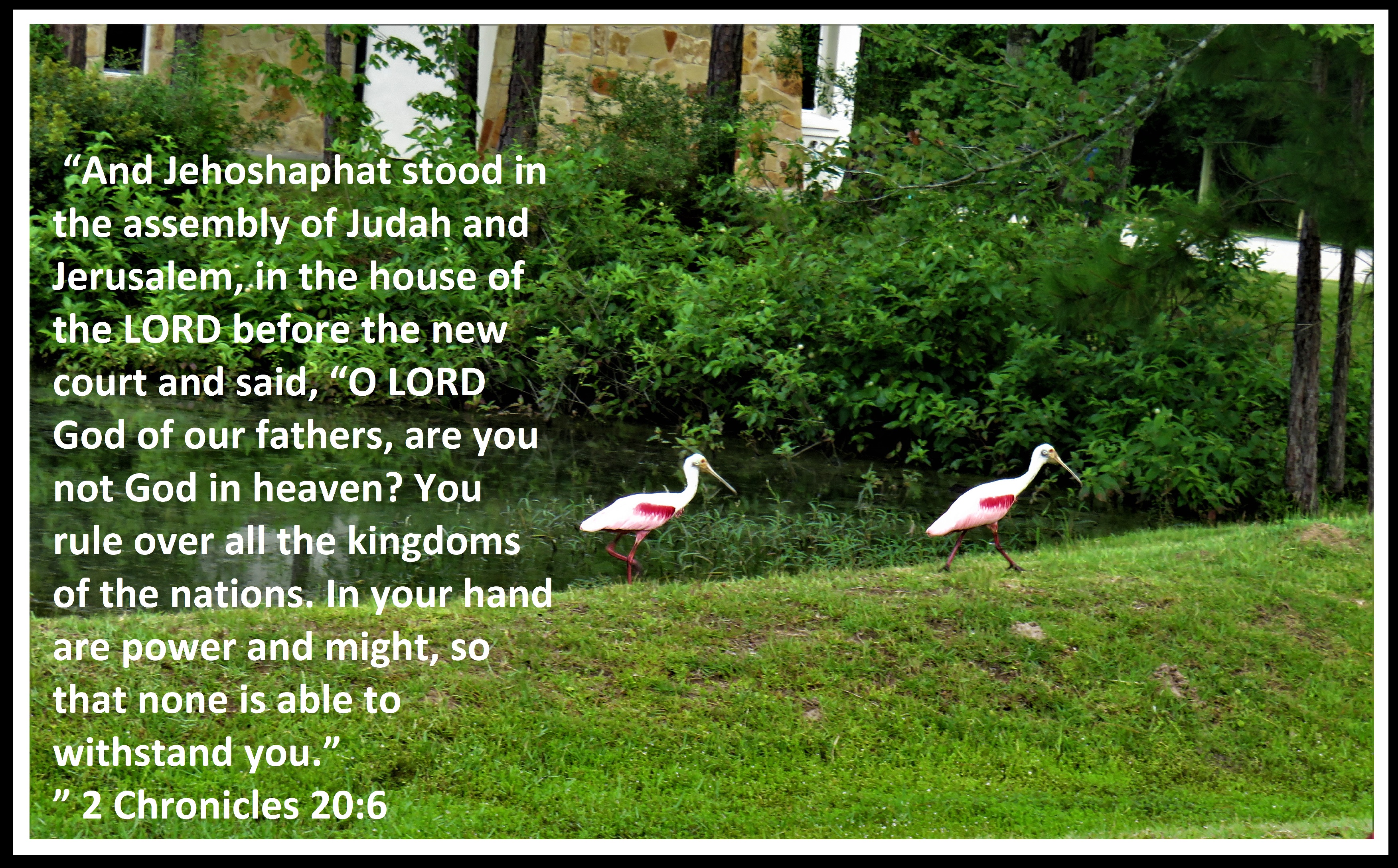 “And Jehoshaphat stood in the assembly of Judah and Jerusalem, in the house of the LORD before the new court and said, “O LORD God of our fathers, are you not God in heaven? You rule over all the kingdoms of the nations. In your hand are power and might, so that none is able to withstand you.”” 2 Chronicles 20:6