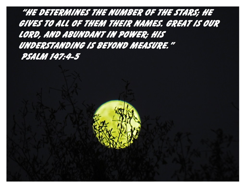 “He determines the number of the stars; he gives to all of them their names. Great is our Lord, and abundant in power; his understanding is beyond measure.” Psalm 147:4-5