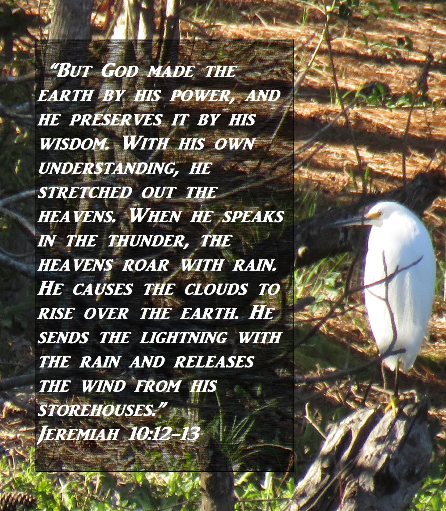 “But God made the earth by his power, and he preserves it by his wisdom. With his own understanding, he stretched out the heavens. When he speaks in the thunder, the heavens roar with rain. He causes the clouds to rise over the earth. He sends the lightning with the rain and releases the wind from his storehouses.” Jeremiah 10:12-13