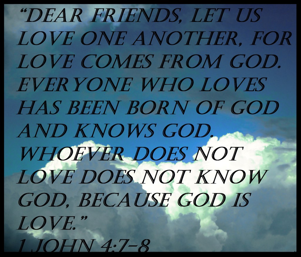 “Dear friends, let us love one another, for love comes from God. Everyone who loves has been born of God and knows God. Whoever does not love does not know God, because God is love.” 1 John 4:7-8