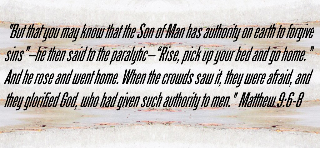 “But that you may know that the Son of Man has authority on earth to forgive sins”—he then said to the paralytic—“Rise, pick up your bed and go home.” And he rose and went home. When the crowds saw it, they were afraid, and they glorified God, who had given such authority to men.” Matthew 9:6-8