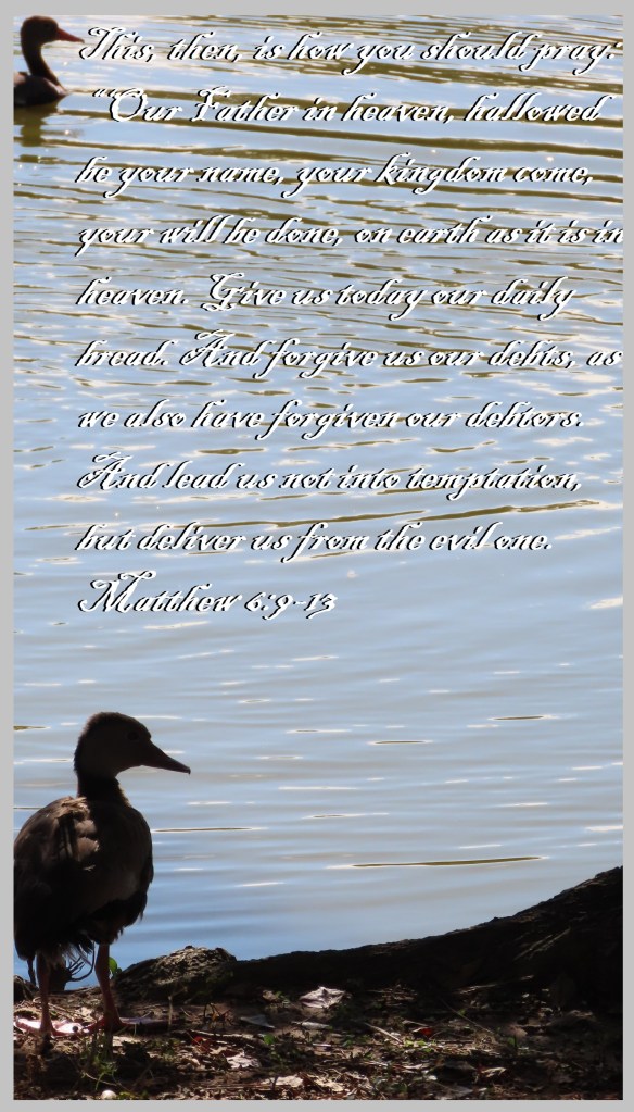 “‘Our Father in heaven, hallowed be your name, your kingdom come, your will be done, on earth as it is in heaven. Give us today our daily bread. And forgive us our debts, as we also have forgiven our debtors. And lead us not into temptation, but deliver us from the evil one. Matthew 6:9-13