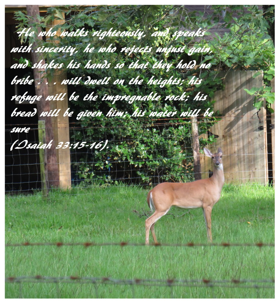 He who walks righteously, and speaks with sincerity, he who rejects unjust gain, and shakes his hands so that they hold no bribe . . . will dwell on the heights; his refuge will be the impregnable rock; his bread will be given him; his water will be sure (Isaiah 33:15-16).