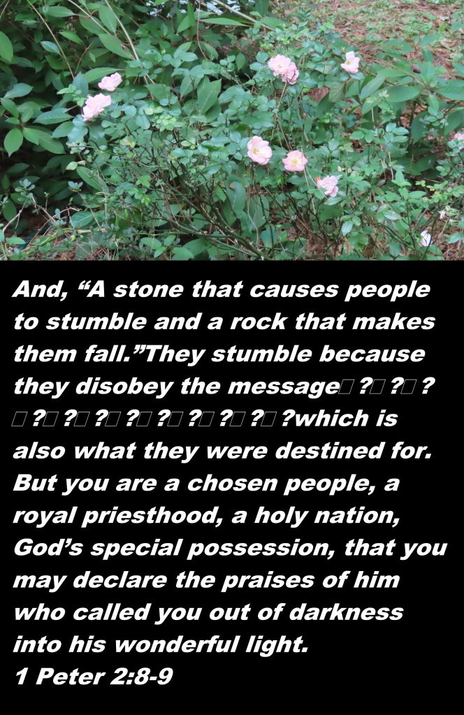 And, “A stone that causes people to stumble and a rock that makes them fall.”They stumble because they disobey the message������������which is also what they were destined for. But you are a chosen people, a royal priesthood, a holy nation, God’s special possession, that you may declare the praises of him who called you out of darkness into his wonderful light. 1 Peter 2:8-9
