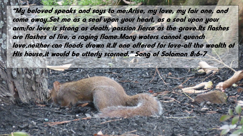 “My beloved speaks and says to me:Arise, my love, my fair one, and come away.Set me as a seal upon your heart, as a seal upon your arm;for love is strong as death, passion fierce as the grave.Its flashes are flashes of fire, a raging flame.Many waters cannot quench love,neither can floods drown it.If one offered for love-all the wealth of His house,it would be utterly scorned.” Song of Solomon 8:6-7