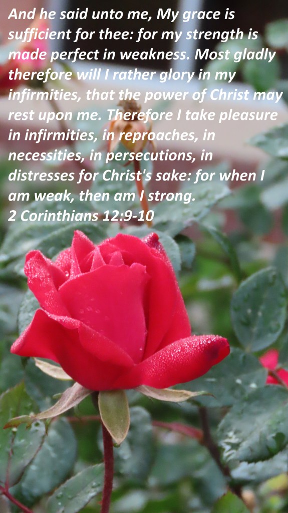 And he said unto me, My grace is sufficient for thee: for my strength is made perfect in weakness. Most gladly therefore will I rather glory in my infirmities, that the power of Christ may rest upon me. Therefore I take pleasure in infirmities, in reproaches, in necessities, in persecutions, in distresses for Christ’s sake: for when I am weak, then am I strong.