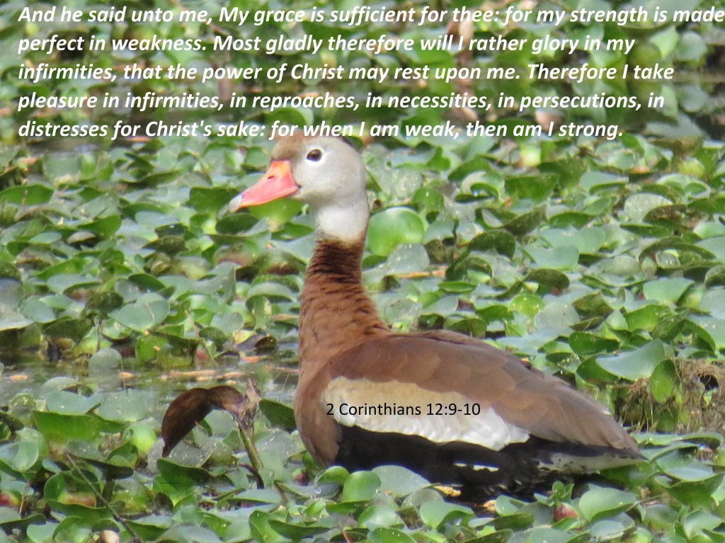 And he said unto me, My grace is sufficient for thee: for my strength is made perfect in weakness. Most gladly therefore will I rather glory in my infirmities, that the power of Christ may rest upon me. Therefore I take pleasure in infirmities, in reproaches, in necessities, in persecutions, in distresses for Christ’s sake: for when I am weak, then am I strong.