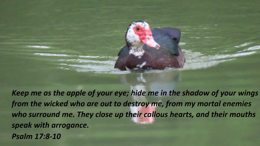 Keep me as the apple of your eye; hide me in the shadow of your wings from the wicked who are out to destroy me, from my mortal enemies who surround me. They close up their callous hearts, and their mouths speak with arrogance.