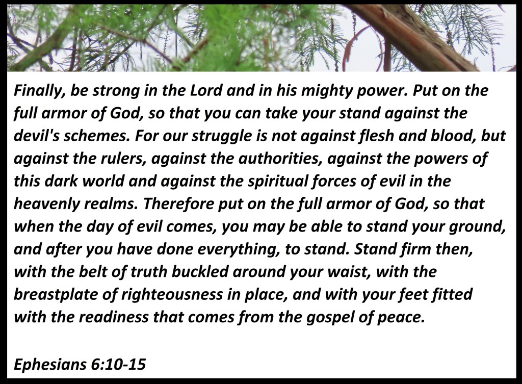 Finally, be strong in the Lord and in his mighty power. Put on the full armor of God, so that you can take your stand against the devil’s schemes. For our struggle is not against flesh and blood, but against the rulers, against the authorities, against the powers of this dark world and against the spiritual forces of evil in the heavenly realms. Therefore put on the full armor of God, so that when the day of evil comes, you may be able to stand your ground, and after you have done everything, to stand. Stand firm then, with the belt of truth buckled around your waist, with the breastplate of righteousness in place, and with your feet fitted with the readiness that comes from the gospel of peace.
