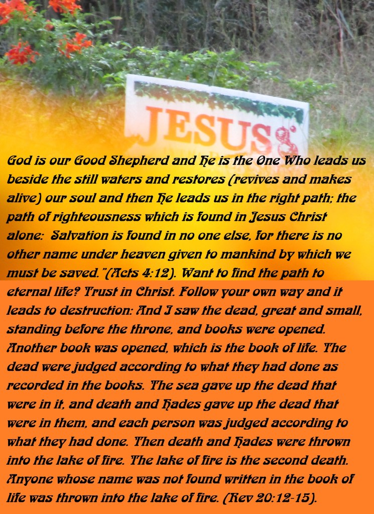 God is our Good Shepherd and He is the One Who leads us beside the still waters and restores (revives and makes alive) our soul and then He leads us in the right path; the path of righteousness which is found in Jesus Christ alone: Salvation is found in no one else, for there is no other name under heaven given to mankind by which we must be saved.”(Acts 4:12). Want to find the path to eternal life? Trust in Christ. Follow your own way and it leads to destruction: And I saw the dead, great and small, standing before the throne, and books were opened. Another book was opened, which is the book of life. The dead were judged according to what they had done as recorded in the books. The sea gave up the dead that were in it, and death and Hades gave up the dead that were in them, and each person was judged according to what they had done. Then death and Hades were thrown into the lake of fire. The lake of fire is the second death. Anyone whose name was not found written in the book of life was thrown into the lake of fire. (Rev 20:12-15).