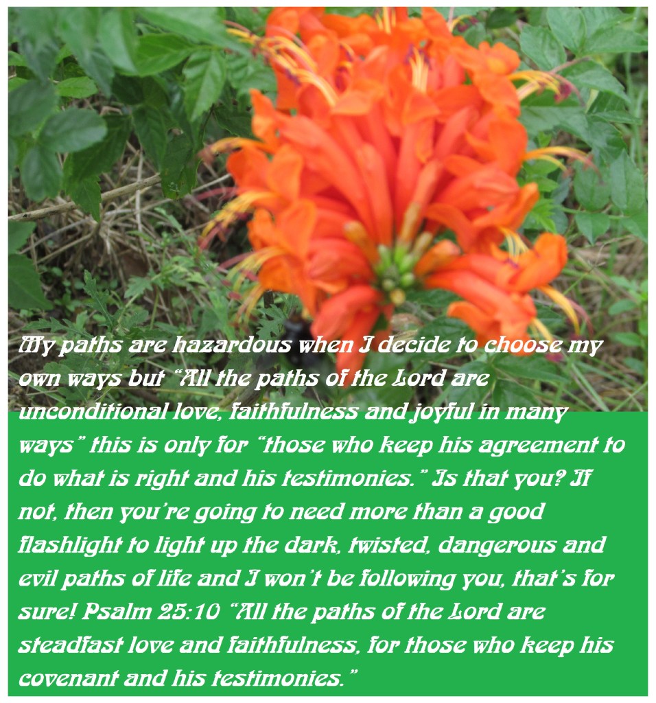 My paths are hazardous when I decide to choose my own ways but “All the paths of the Lord are unconditional love, faithfulness and joyful in many ways” this is only for “those who keep his agreement to do what is right and his testimonies.” Is that you? If not, then you’re going to need more than a good flashlight to light up the dark, twisted, dangerous and evil paths of life and I won’t be following you, that’s for sure! Psalm 25:10 “All the paths of the Lord are steadfast love and faithfulness, for those who keep his covenant and his testimonies.”
