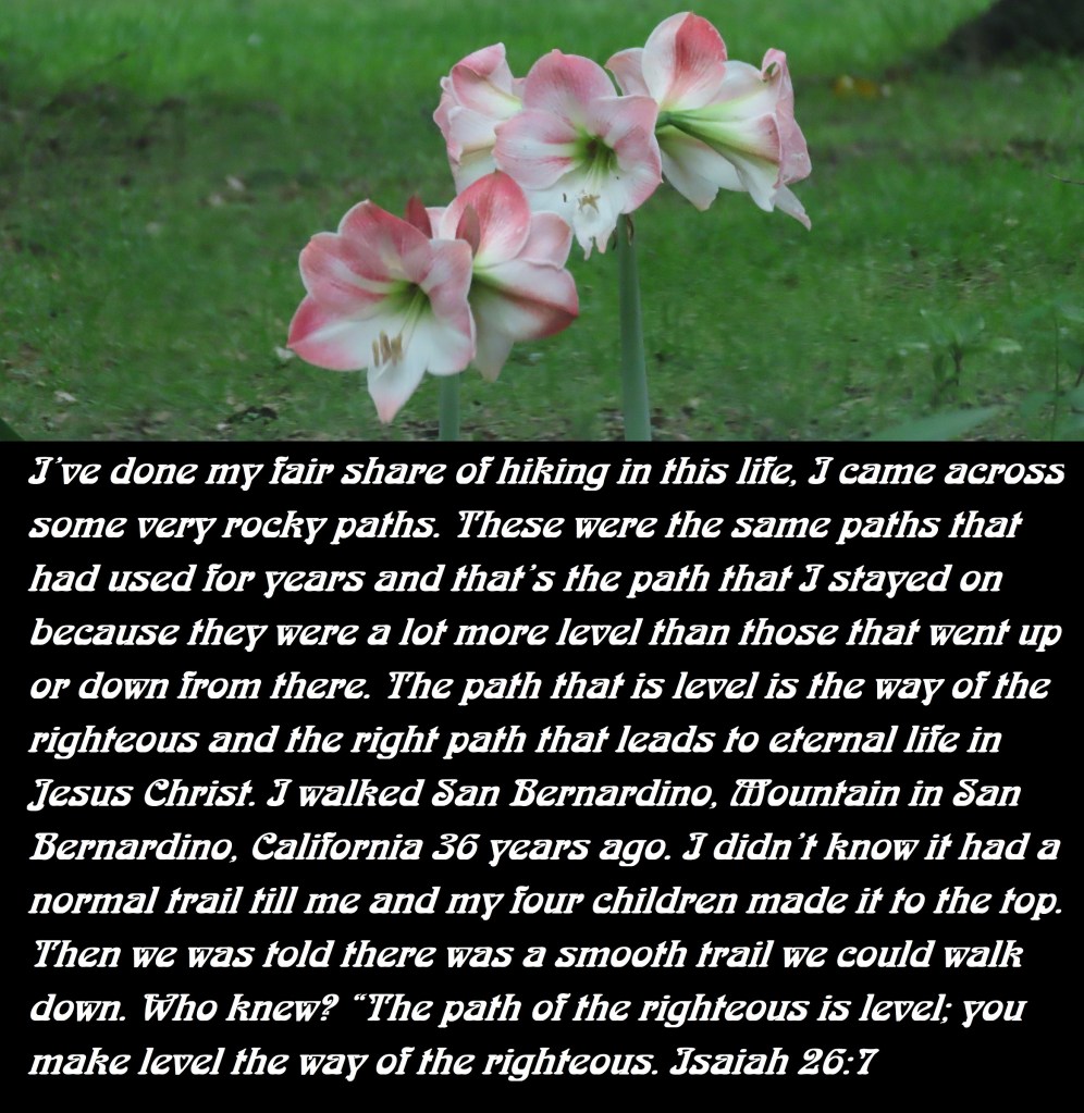 I’ve done my fair share of hiking in this life, I came across some very rocky paths. These were the same paths that had used for years and that’s the path that I stayed on because they were a lot more level than those that went up or down from there. The path that is level is the way of the righteous and the right path that leads to eternal life in Jesus Christ. I walked San Bernardino, Mountain in San Bernardino, California 36 years ago. I didn’t know it had a normal trail till me and my four children made it to the top. Then we was told there was a smooth trail we could walk down. Who knew? “The path of the righteous is level; you make level the way of the righteous. Isaiah 26:7