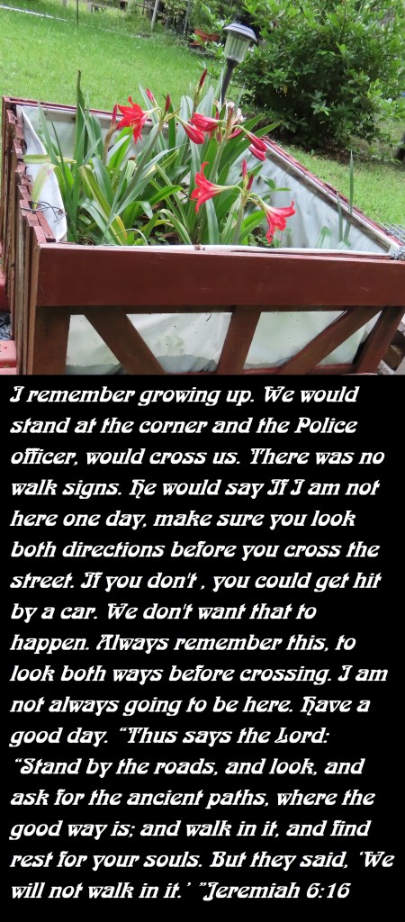 I remember growing up. We would stand at the corner and the Police officer, would cross us. There was no walk signs. He would say If I am not here one day, make sure you look both directions before you cross the street. If you don’t , you could get hit by a car. We don’t want that to happen. Always remember this, to look both ways before crossing. I am not always going to be here. Have a good day. “Thus says the Lord: “Stand by the roads, and look, and ask for the ancient paths, where the good way is; and walk in it, and find rest for your souls. But they said, ‘We will not walk in it.’ ”Jeremiah 6:16