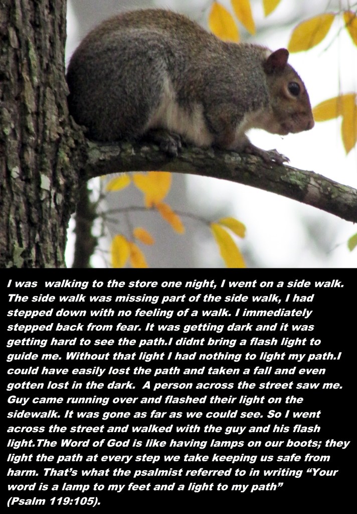 I was walking to the store one night, I went on a side walk. The side walk was missing part of the side walk, I had stepped down with no feeling of a walk. I immediately stepped back from fear. It was getting dark and it was getting hard to see the path. I didn’t bring a flash light to guide me. Without that light I had nothing to light my path.I could have easily lost the path and taken a fall and even gotten lost in the dark. A person across the street saw me. Guy came running over and flashed their light on the sidewalk. It was gone as far as we could see. So I went across the street and walked with the guy and his flash light.The Word of God is like having lamps on our boots; they light the path at every step we take keeping us safe from harm. That’s what the psalmist referred to in writing “Your word is a lamp to my feet and a light to my path” (Psalm 119:105).