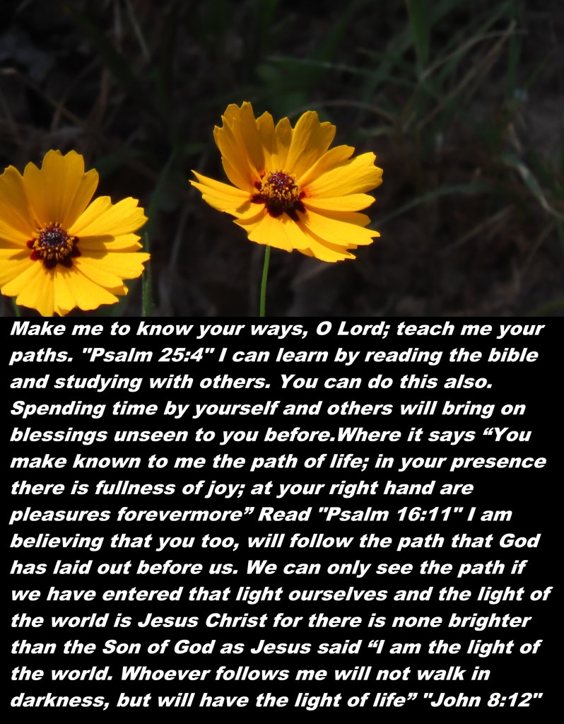 Make me to know your ways, O Lord; teach me your paths. “Psalm 25:4” I can learn by reading the bible and studying with others. You can do this also. Spending time by yourself and others will bring on blessings unseen to you before.Where it says “You make known to me the path of life; in your presence there is fullness of joy; at your right hand are pleasures forevermore” Read “Psalm 16:11” I am believing that you too, will follow the path that God has laid out before us. We can only see the path if we have entered that light ourselves and the light of the world is Jesus Christ for there is none brighter than the Son of God as Jesus said “I am the light of the world. Whoever follows me will not walk in darkness, but will have the light of life” “John 8:12”