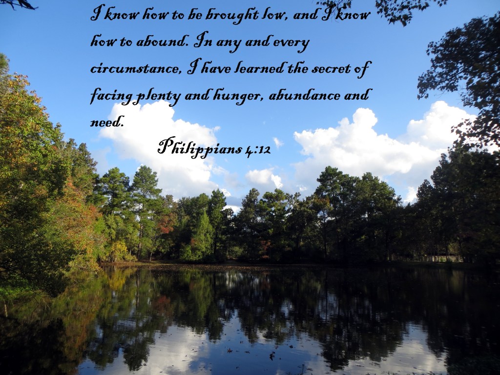I know how to be brought low, and I know how to abound. In any and every circumstance, I have learned the secret of facing plenty and hunger, abundance and need. Philippians 4:12