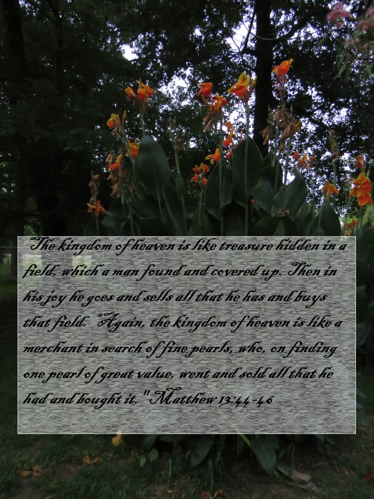 “The kingdom of heaven is like treasure hidden in a field, which a man found and covered up. Then in his joy he goes and sells all that he has and buys that field. “Again, the kingdom of heaven is like a merchant in search of fine pearls, who, on finding one pearl of great value, went and sold all that he had and bought it.” Matthew 13:44-46