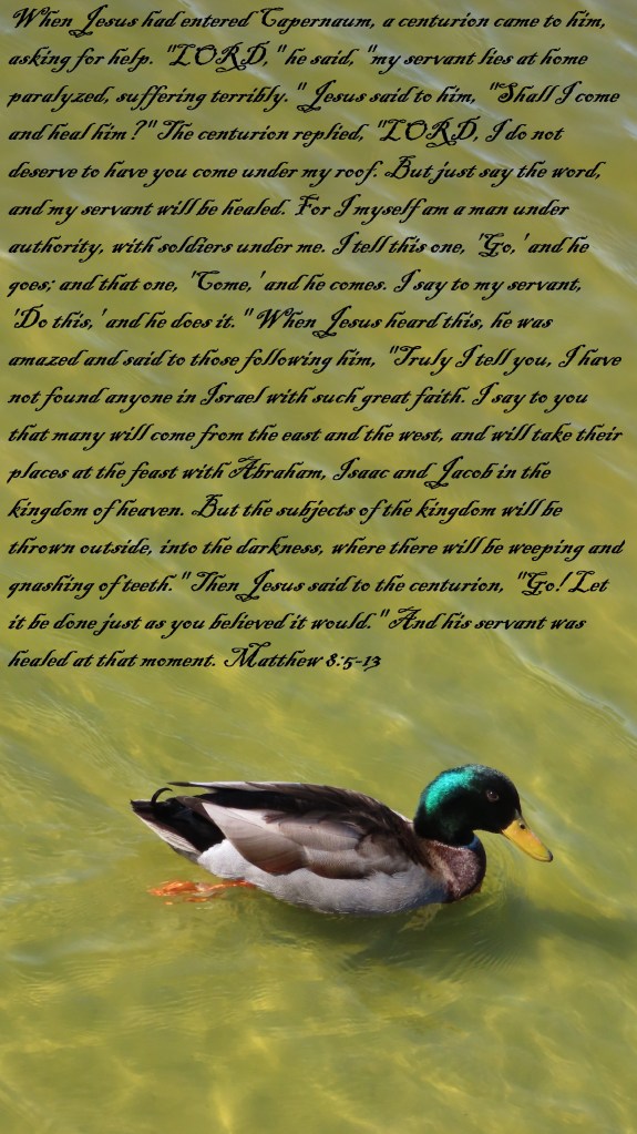 When Jesus had entered Capernaum, a centurion came to him, asking for help. “LORD,” he said, “my servant lies at home paralyzed, suffering terribly.” Jesus said to him, “Shall I come and heal him?” The centurion replied, “LORD, I do not deserve to have you come under my roof. But just say the word, and my servant will be healed. For I myself am a man under authority, with soldiers under me. I tell this one, ‘Go,’ and he goes; and that one, ‘Come,’ and he comes. I say to my servant, ‘Do this,’ and he does it.” When Jesus heard this, he was amazed and said to those following him, “Truly I tell you, I have not found anyone in Israel with such great faith. I say to you that many will come from the east and the west, and will take their places at the feast with Abraham, Isaac and Jacob in the kingdom of heaven. But the subjects of the kingdom will be thrown outside, into the darkness, where there will be weeping and gnashing of teeth.” Then Jesus said to the centurion, “Go! Let it be done just as you believed it would.” And his servant was healed at that moment.