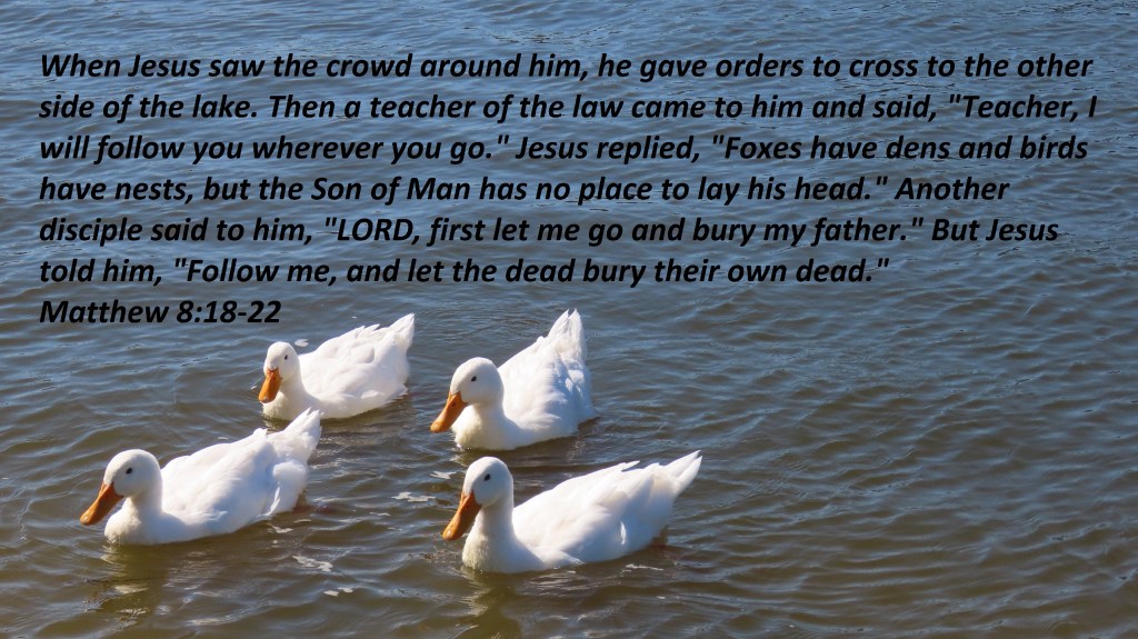 When Jesus saw the crowd around him, he gave orders to cross to the other side of the lake. Then a teacher of the law came to him and said, “Teacher, I will follow you wherever you go.” Jesus replied, “Foxes have dens and birds have nests, but the Son of Man has no place to lay his head.” Another disciple said to him, “LORD, first let me go and bury my father.” But Jesus told him, “Follow me, and let the dead bury their own dead.”