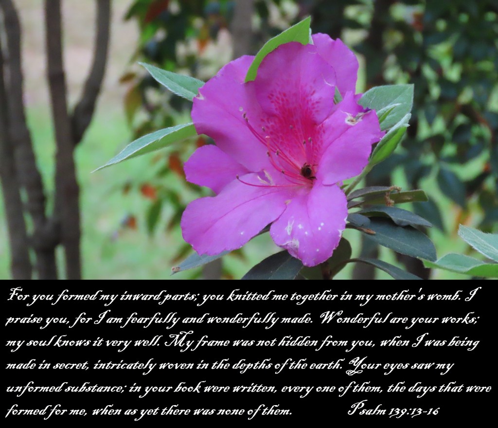 For you formed my inward parts; you knitted me together in my mother’s womb. I praise you, for I am fearfully and wonderfully made. Wonderful are your works; my soul knows it very well. My frame was not hidden from you, when I was being made in secret, intricately woven in the depths of the earth. Your eyes saw my unformed substance; in your book were written, every one of them, the days that were formed for me, when as yet there was none of them. Psalm 139:13-16