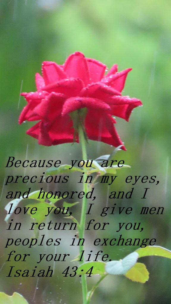 Because you are precious in my eyes, and honored, and I love you, I give men in return for you, peoples in exchange for your life.