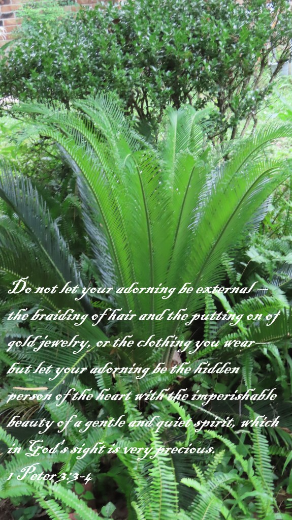 Do not let your adorning be external—the braiding of hair and the putting on of gold jewelry, or the clothing you wear— but let your adorning be the hidden person of the heart with the imperishable beauty of a gentle and quiet spirit, which in God’s sight is very precious. 1 Peter 3:3-4