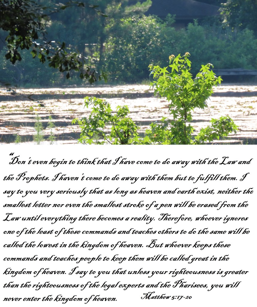 “Don’t even begin to think that I have come to do away with the Law and the Prophets. I haven’t come to do away with them but to fulfill them. I say to you very seriously that as long as heaven and earth exist, neither the smallest letter nor even the smallest stroke of a pen will be erased from the Law until everything there becomes a reality. Therefore, whoever ignores one of the least of these commands and teaches others to do the same will be called the lowest in the kingdom of heaven. But whoever keeps these commands and teaches people to keep them will be called great in the kingdom of heaven. I say to you that unless your righteousness is greater than the righteousness of the legal experts and the Pharisees, you will never enter the kingdom of heaven.
