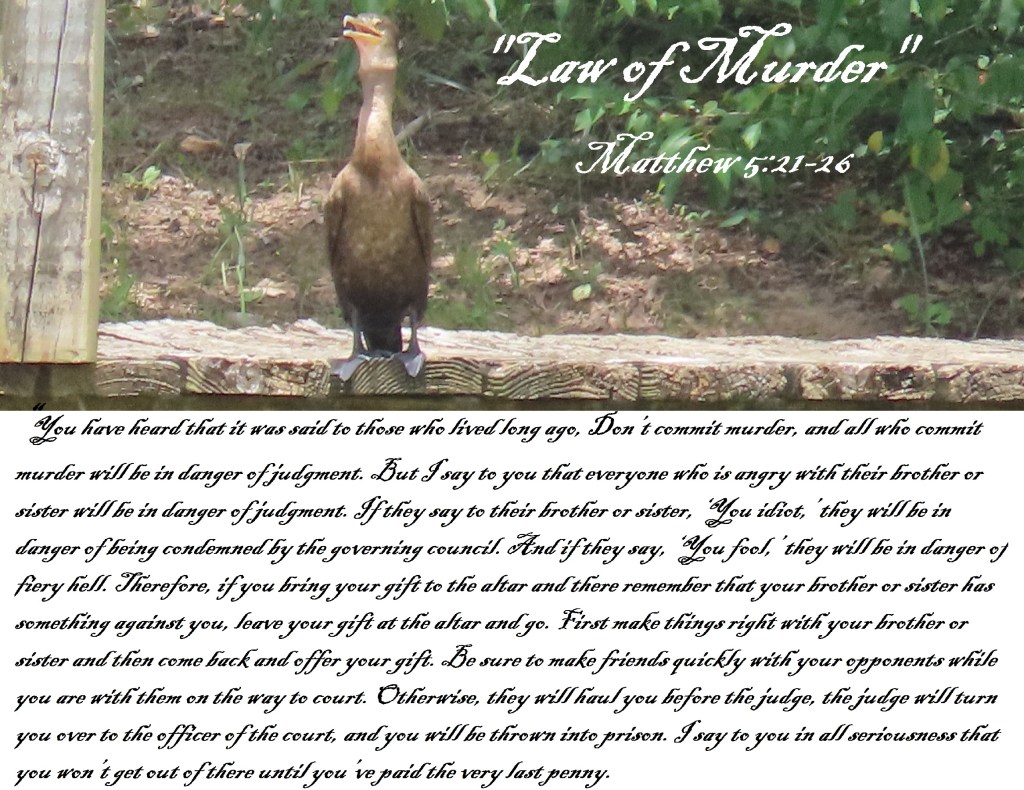 “You have heard that it was said to those who lived long ago, Don’t commit murder, and all who commit murder will be in danger of judgment. But I say to you that everyone who is angry with their brother or sister will be in danger of judgment. If they say to their brother or sister, ‘You idiot,’ they will be in danger of being condemned by the governing council. And if they say, ‘You fool,’ they will be in danger of fiery hell. Therefore, if you bring your gift to the altar and there remember that your brother or sister has something against you, leave your gift at the altar and go. First make things right with your brother or sister and then come back and offer your gift. Be sure to make friends quickly with your opponents while you are with them on the way to court. Otherwise, they will haul you before the judge, the judge will turn you over to the officer of the court, and you will be thrown into prison. I say to you in all seriousness that you won’t get out of there until you’ve paid the very last penny.