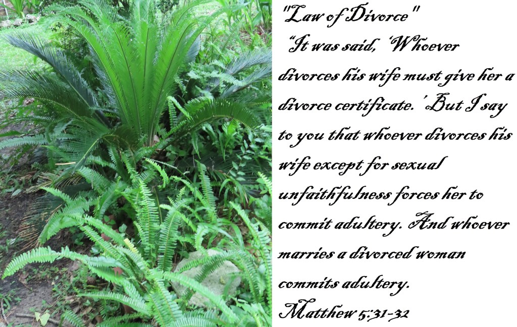 “It was said, ‘Whoever divorces his wife must give her a divorce certificate.’ But I say to you that whoever divorces his wife except for sexual unfaithfulness forces her to commit adultery. And whoever marries a divorced woman commits adultery.