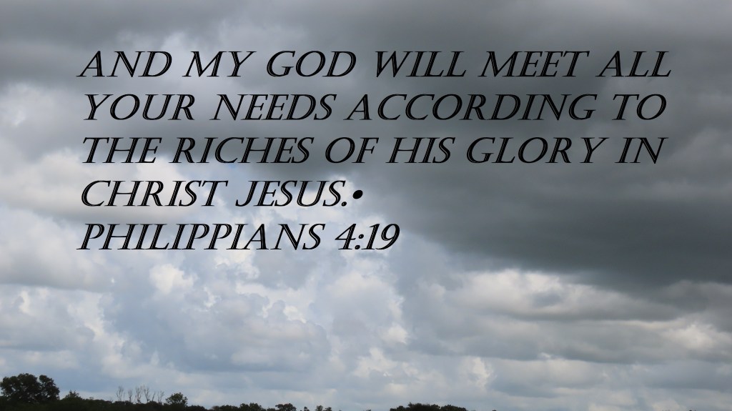 Uncategorized “You Are Blessed” Date: July 29, 2020Author: © Christian National Church of Christ 0 Comments And my God will meet all your needs according to the riches of his glory in Christ Jesus. Philippians 4:19 Share this: Share on X (Opens in new window) X Share on Facebook (Opens in new window) Facebook Like Loading... Related