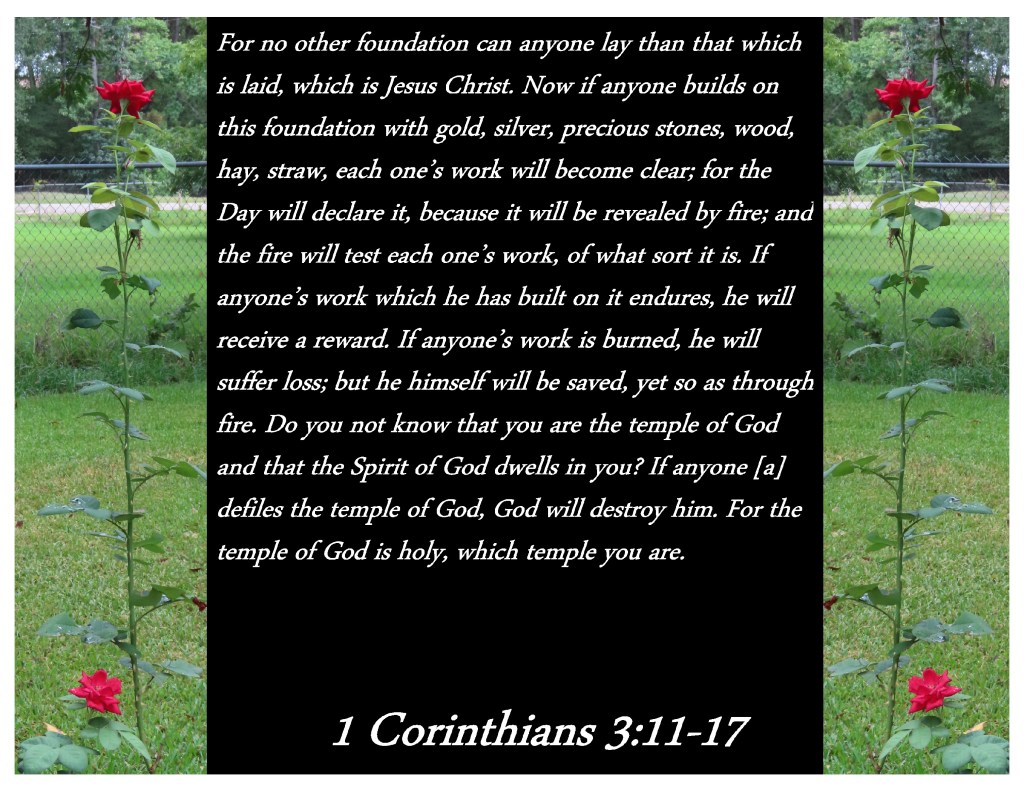 For no other foundation can anyone lay than that which is laid, which is Jesus Christ. Now if anyone builds on this foundation with gold, silver, precious stones, wood, hay, straw, each one’s work will become clear; for the Day will declare it, because it will be revealed by fire; and the fire will test each one’s work, of what sort it is. If anyone’s work which he has built on it endures, he will receive a reward. If anyone’s work is burned, he will suffer loss; but he himself will be saved, yet so as through fire. Do you not know that you are the temple of God and that the Spirit of God dwells in you? If anyone defiles the temple of God, God will destroy him. For the temple of God is holy, which temple you are.