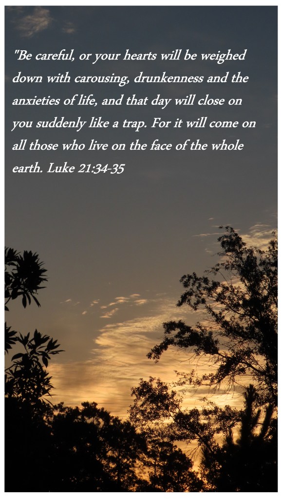 “Be careful, or your hearts will be weighed down with carousing, drunkenness and the anxieties of life, and that day will close on you suddenly like a trap. For it will come on all those who live on the face of the whole earth. Luke 21:34-35