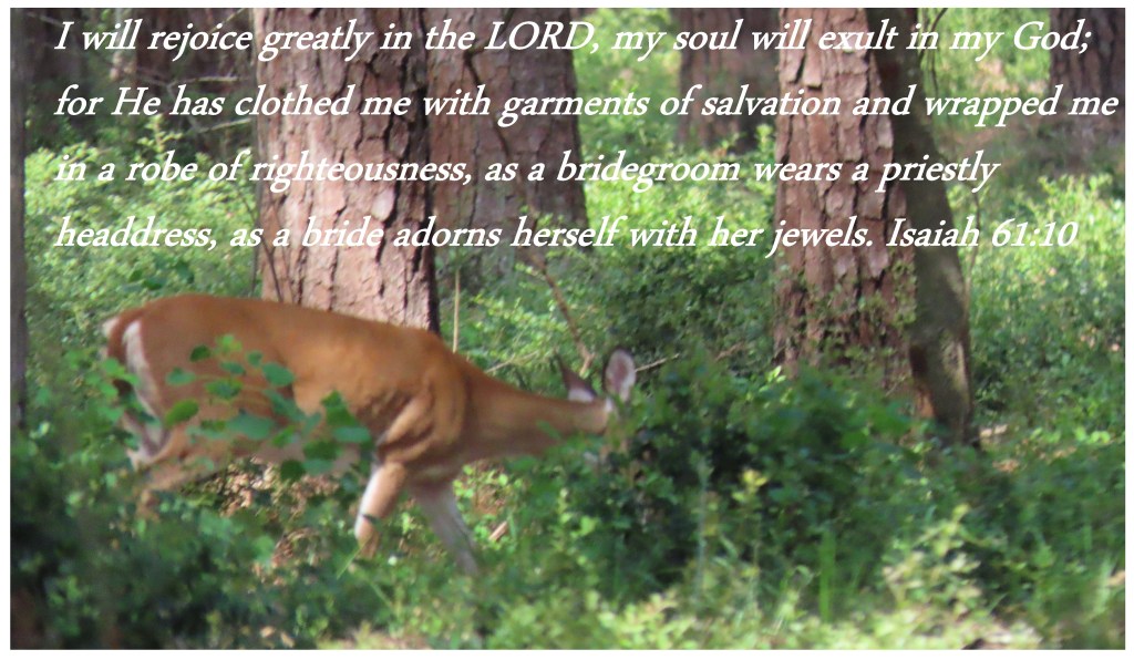 I will rejoice greatly in the LORD, my soul will exult in my God; for He has clothed me with garments of salvation and wrapped me in a robe of righteousness, as a bridegroom wears a priestly headdress, as a bride adorns herself with her jewels. Isaiah 61:10