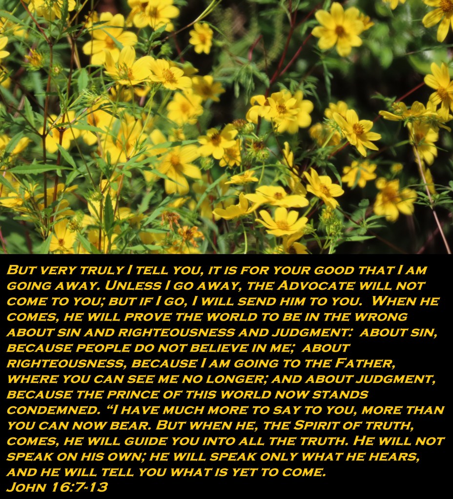 But very truly I tell you, it is for your good that I am going away. Unless I go away, the Advocate will not come to you; but if I go, I will send him to you. When he comes, he will prove the world to be in the wrong about sin and righteousness and judgment: about sin, because people do not believe in me; about righteousness, because I am going to the Father, where you can see me no longer; and about judgment, because the prince of this world now stands condemned. “I have much more to say to you, more than you can now bear. But when he, the Spirit of truth, comes, he will guide you into all the truth. He will not speak on his own; he will speak only what he hears, and he will tell you what is yet to come.