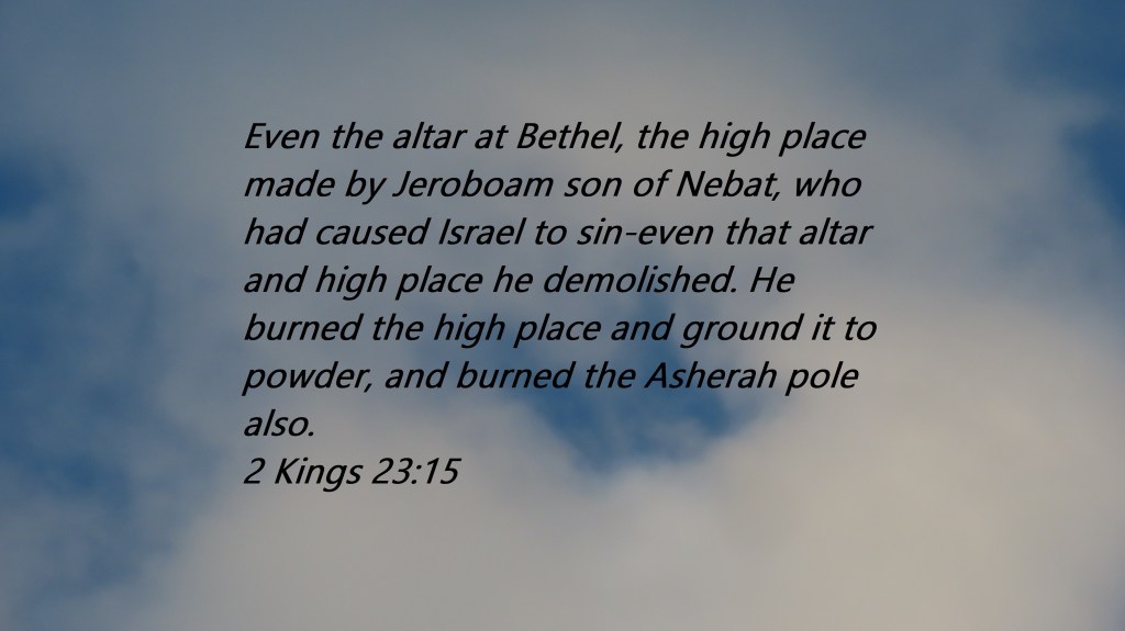 Even the altar at Bethel, the high place made by Jeroboam son of Nebat, who had caused Israel to sin-even that altar and high place he demolished. He burned the high place and ground it to powder, and burned the Asherah pole also.