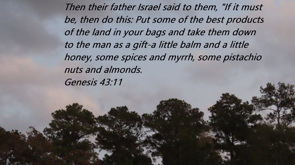 Then their father Israel said to them, “If it must be, then do this: Put some of the best products of the land in your bags and take them down to the man as a gift-a little balm and a little honey, some spices and myrrh, some pistachio nuts and almonds. Genesis 43:11