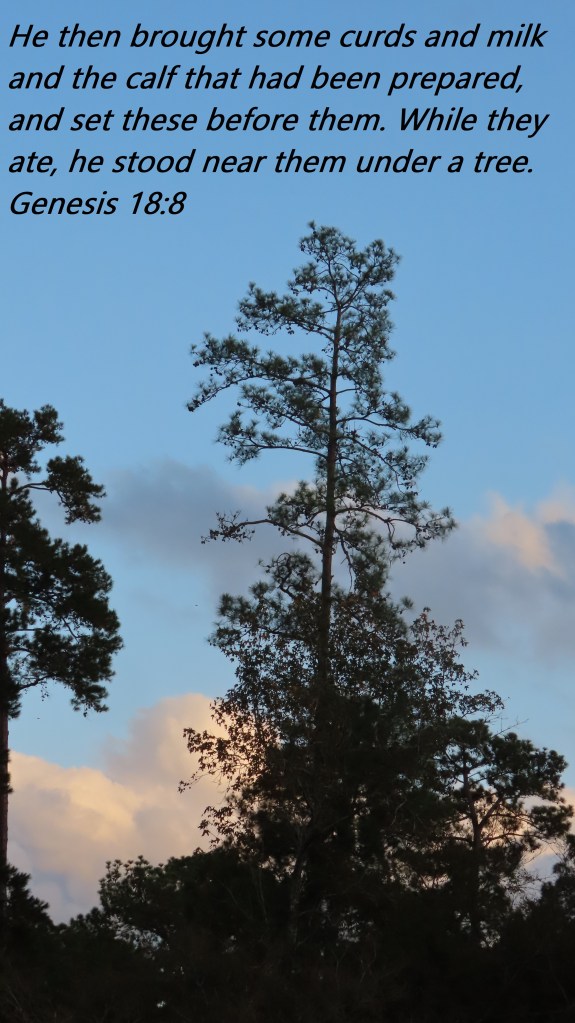 He then brought some curds and milk and the calf that had been prepared, and set these before them. While they ate, he stood near them under a tree. Genesis 18:8