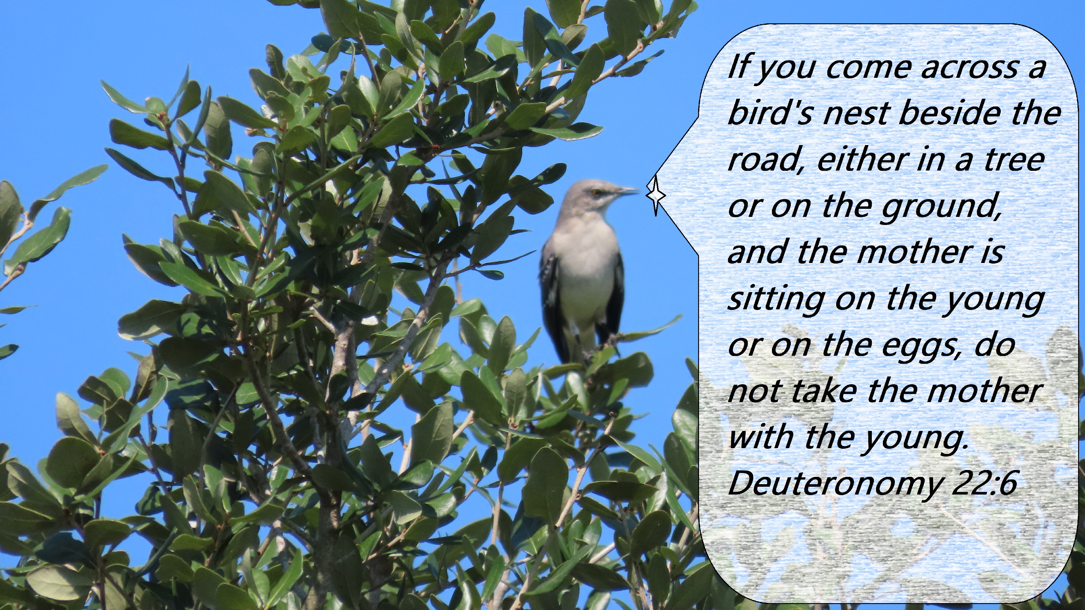 If you come across a bird’s nest beside the road, either in a tree or on the ground, and the mother is sitting on the young or on the eggs, do not take the mother with the young. Deuteronomy 22:6
