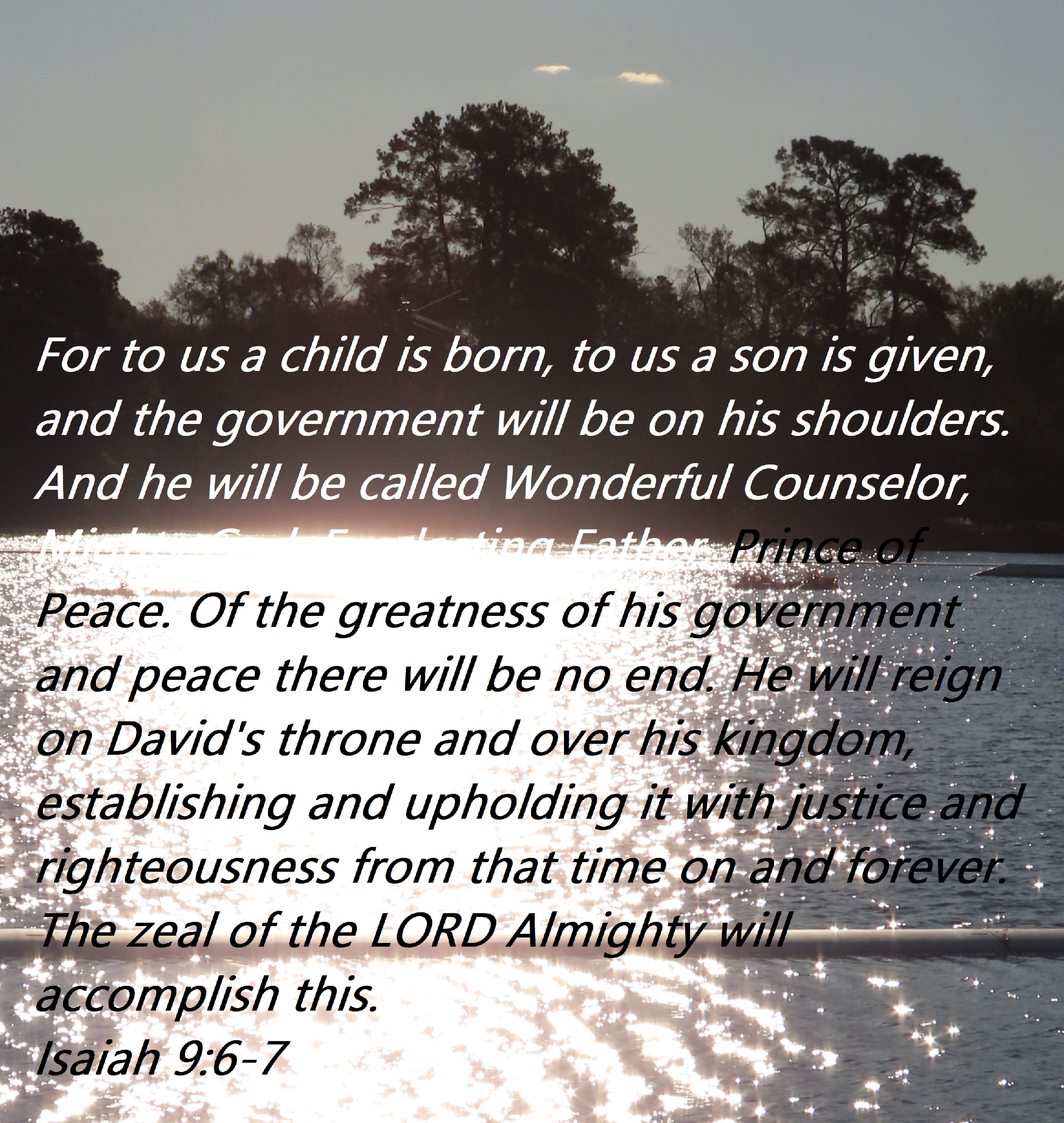 For to us a child is born, to us a son is given, and the government will be on his shoulders. And he will be called Wonderful Counselor, Mighty God, Everlasting Father, Prince of Peace. Of the greatness of his government and peace there will be no end. He will reign on David’s throne and over his kingdom, establishing and upholding it with justice and righteousness from that time on and forever. The zeal of the LORD Almighty will accomplish this.