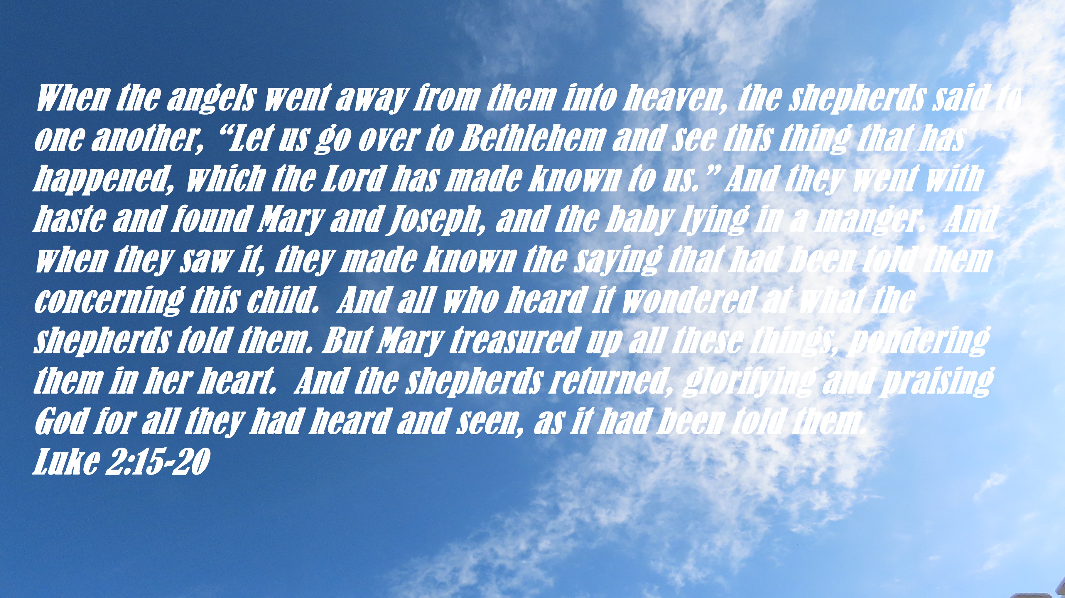 When the angels went away from them into heaven, the shepherds said to one another, “Let us go over to Bethlehem and see this thing that has happened, which the Lord has made known to us.” And they went with haste and found Mary and Joseph, and the baby lying in a manger. And when they saw it, they made known the saying that had been told them concerning this child. And all who heard it wondered at what the shepherds told them. But Mary treasured up all these things, pondering them in her heart. And the shepherds returned, glorifying and praising God for all they had heard and seen, as it had been told them.