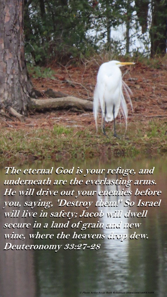 The eternal God is your refuge, and underneath are the everlasting arms. He will drive out your enemies before you, saying, ‘Destroy them!’ So Israel will live in safety; Jacob will dwell secure in a land of grain and new wine, where the heavens drop dew.