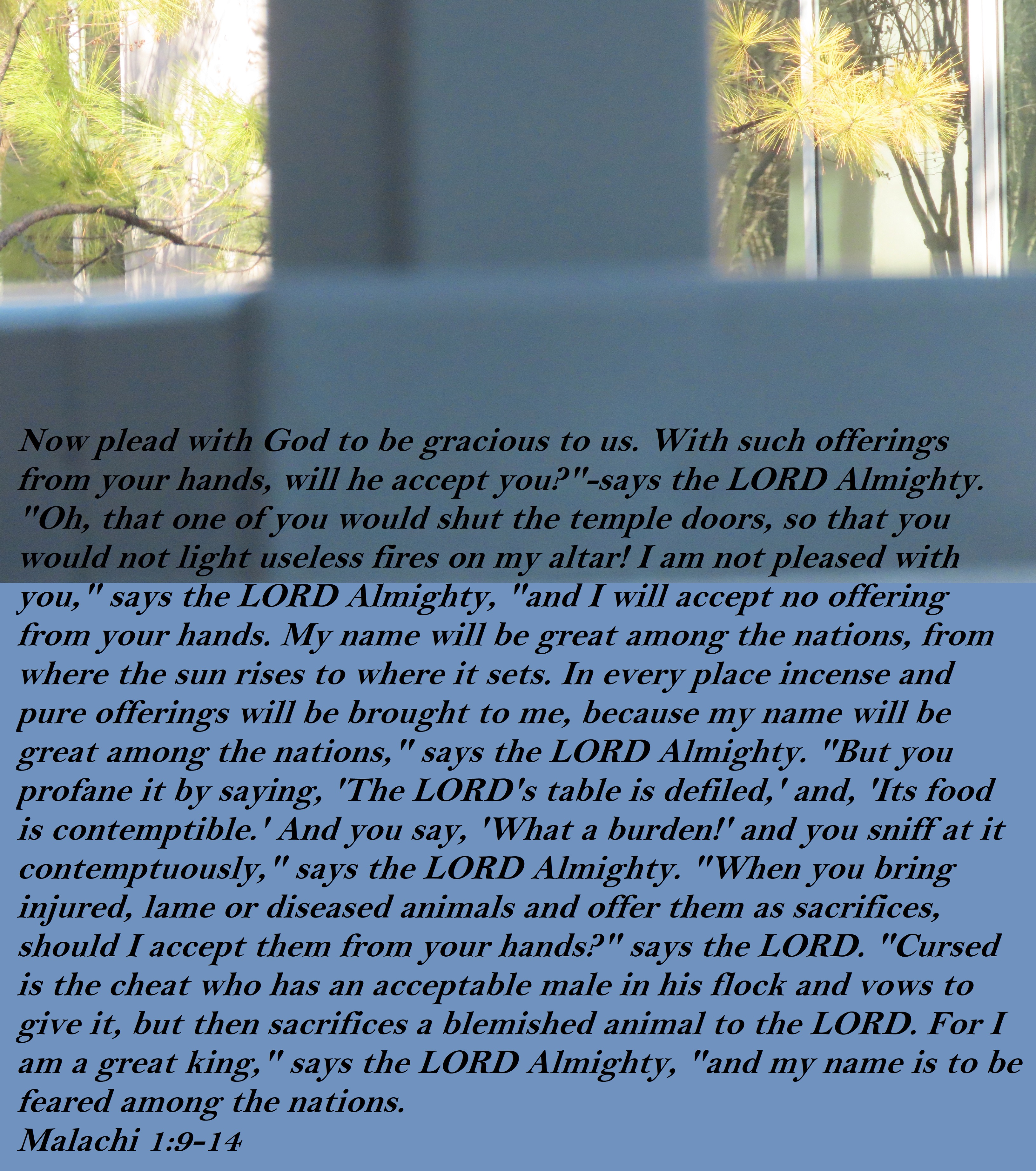 Now plead with God to be gracious to us. With such offerings from your hands, will he accept you?”-says the LORD Almighty. “Oh, that one of you would shut the temple doors, so that you would not light useless fires on my altar! I am not pleased with you,” says the LORD Almighty, “and I will accept no offering from your hands. My name will be great among the nations, from where the sun rises to where it sets. In every place incense and pure offerings will be brought to me, because my name will be great among the nations,” says the LORD Almighty. “But you profane it by saying, ‘The LORD’s table is defiled,’ and, ‘Its food is contemptible.’ And you say, ‘What a burden!’ and you sniff at it contemptuously,” says the LORD Almighty. “When you bring injured, lame or diseased animals and offer them as sacrifices, should I accept them from your hands?” says the LORD. “Cursed is the cheat who has an acceptable male in his flock and vows to give it, but then sacrifices a blemished animal to the LORD. For I am a great king,” says the LORD Almighty, “and my name is to be feared among the nations.