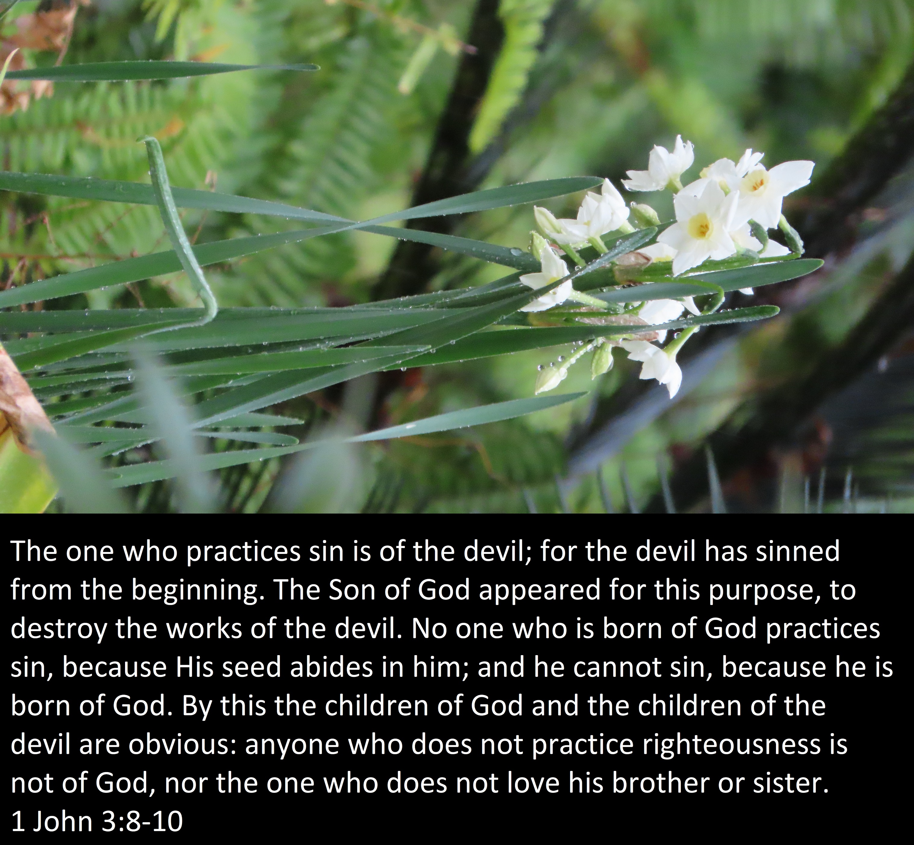 The one who practices sin is of the devil; for the devil has sinned from the beginning. The Son of God appeared for this purpose, to destroy the works of the devil. No one who is born of God practices sin, because His seed abides in him; and he cannot sin, because he is born of God. By this the children of God and the children of the devil are obvious: anyone who does not practice righteousness is not of God, nor the one who does not love his brother.