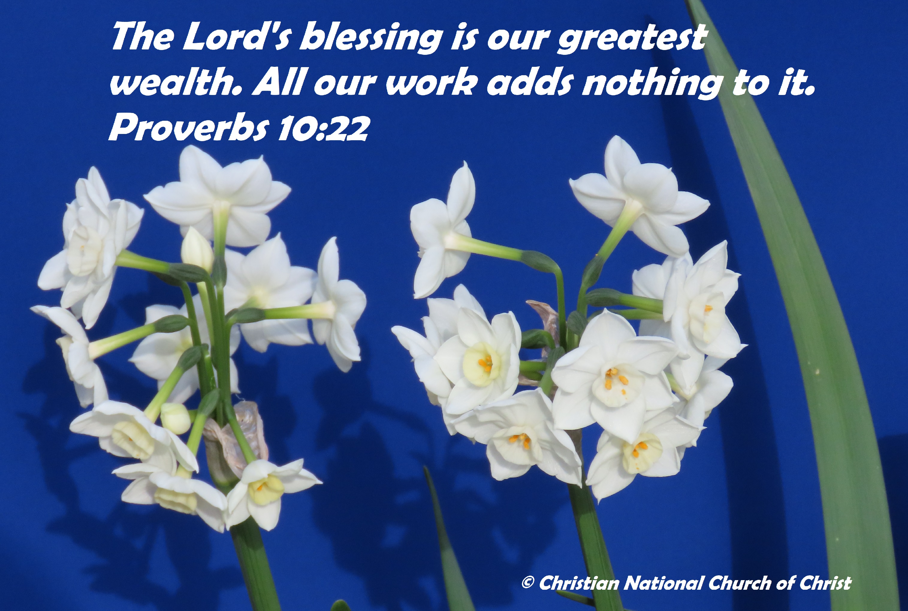 Uncategorized “Lord’s Blessing” Date: February 5, 2021Author: © Christian National Church of Christ 0 Comments The Lord’s blessing is our greatest wealth. All our work adds nothing to it. Proverbs 10:22 Share this: Share on X (Opens in new window) X Share on Facebook (Opens in new window) Facebook Like Loading... Related