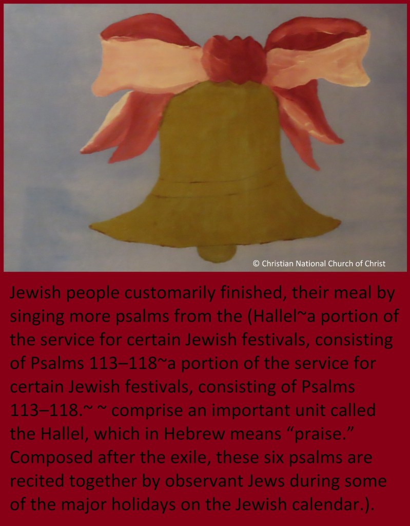 Jewish people customarily finished, their meal by singing more psalms from the (Hallel~a portion of the service for certain Jewish festivals, consisting of Psalms 113–118~a portion of the service for certain Jewish festivals, consisting of Psalms 113–118.~ ~ comprise an important unit called the Hallel, which in Hebrew means “praise.” Composed after the exile, these six psalms are recited together by observant Jews during some of the major holidays on the Jewish calendar.).