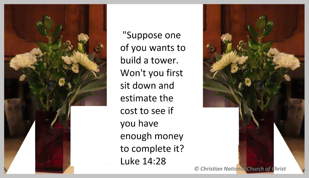 Uncategorized “Journal Before Building” Date: February 20, 2021Author: © Christian National Church of Christ 0 Comments “Suppose one of you wants to build a tower. Won’t you first sit down and estimate the cost to see if you have enough money to complete it? Luke 14:28 Share this: Share on X (Opens in new window) X Share on Facebook (Opens in new window) Facebook Like Loading... Related