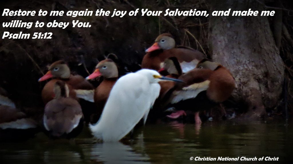 Uncategorized “Witness’s Speak” Date: February 26, 2021Author: © Christian National Church of Christ 0 Comments Restore to me again the joy of Your Salvation, and make me willing to obey You. Psalm 51:12 Share this: Share on X (Opens in new window) X Share on Facebook (Opens in new window) Facebook Like Loading... Related