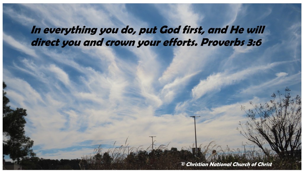 Uncategorized “Put God First” Date: March 1, 2021Author: © Christian National Church of Christ 0 Comments In everything you do, put God first, and He will direct you and crown your efforts. Proverbs 3:6 Share this: Share on X (Opens in new window) X Share on Facebook (Opens in new window) Facebook Like Loading... Related
